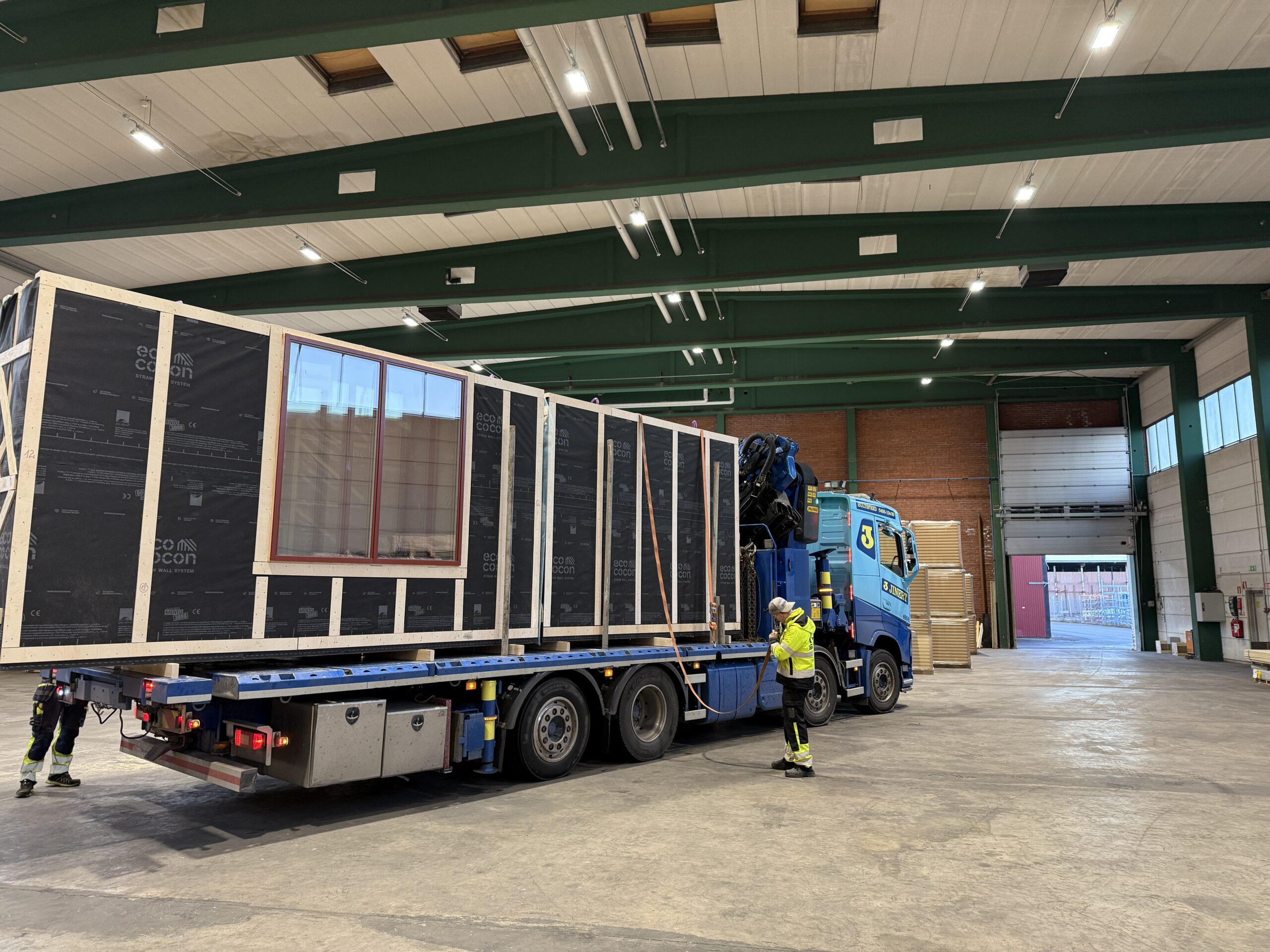 Arbetet startade på morgonen i ETC Byggentreprenads ekohusfabrik där de färdiga väggarna lastades, för att köras till byggarbetsplatsen.