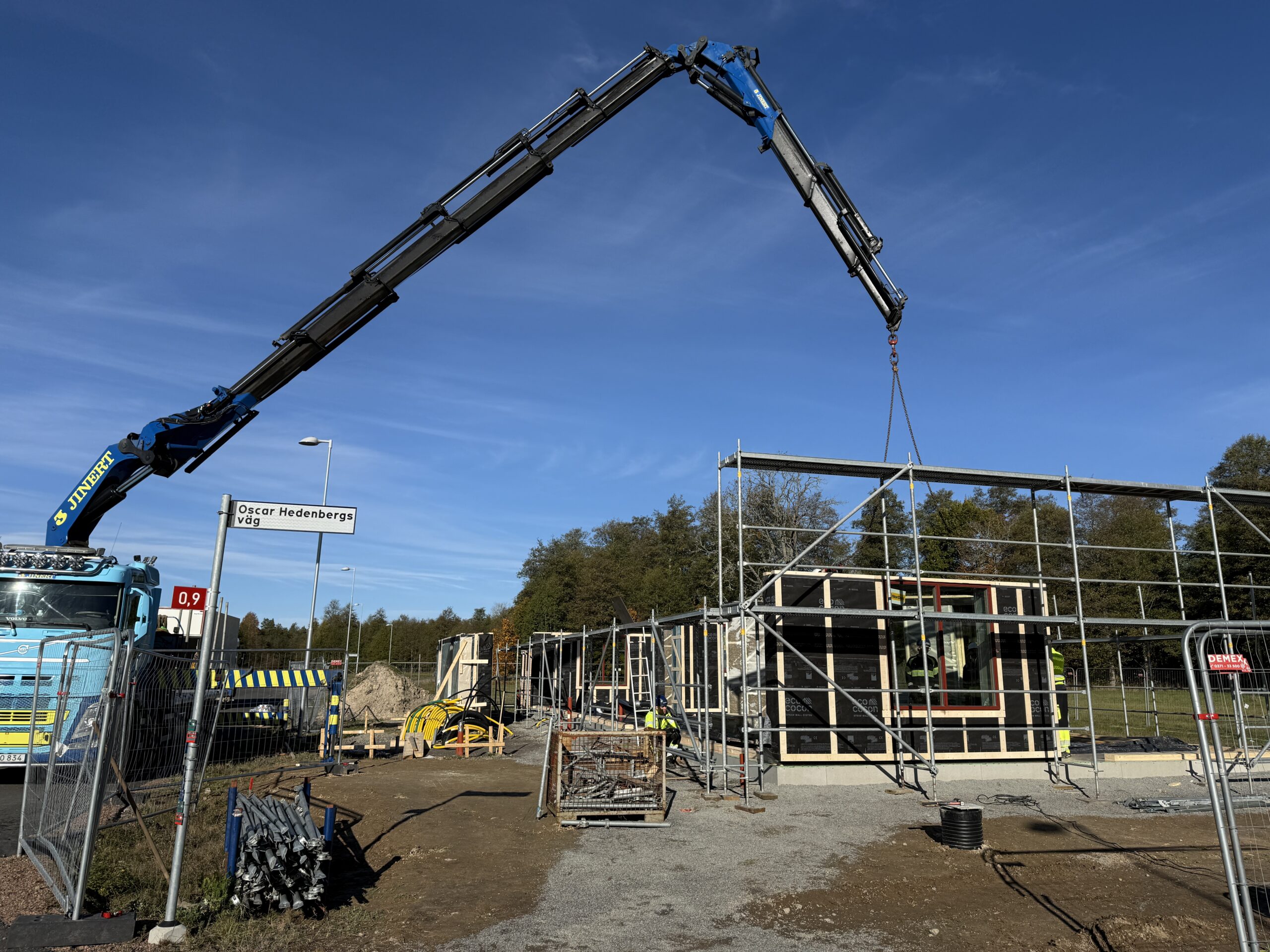 Under torsdagen levererades de första prefabricerade väggarna av trä och halm från ETC Byggentreprenads ekohusfabrik i Hultsfred till bygget av parhus några kilometer därifrån, i Herrstorpet. ”Det gick förvånansvärt smidigt att montera, jag tycker mer och mer om att jobba med de här halmväggarna”, säger platschef Rimas Tarvydas.