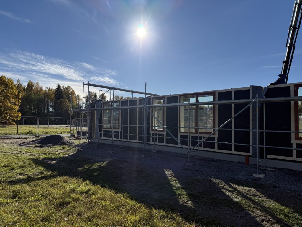 Nu är väggarna på plats och arbetet fortskrider. Nästa steg är att sätta upp takstolar.