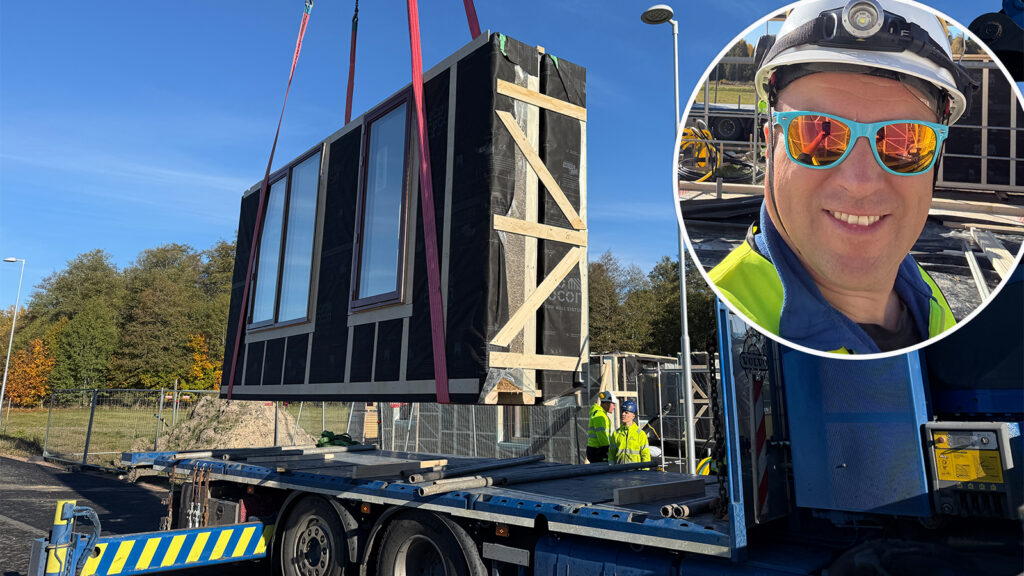 Platschef Rimas Tarvydas (bilden) är nöjd med dagens arbete: ”Det är smidigt att montera de här väggarna.”