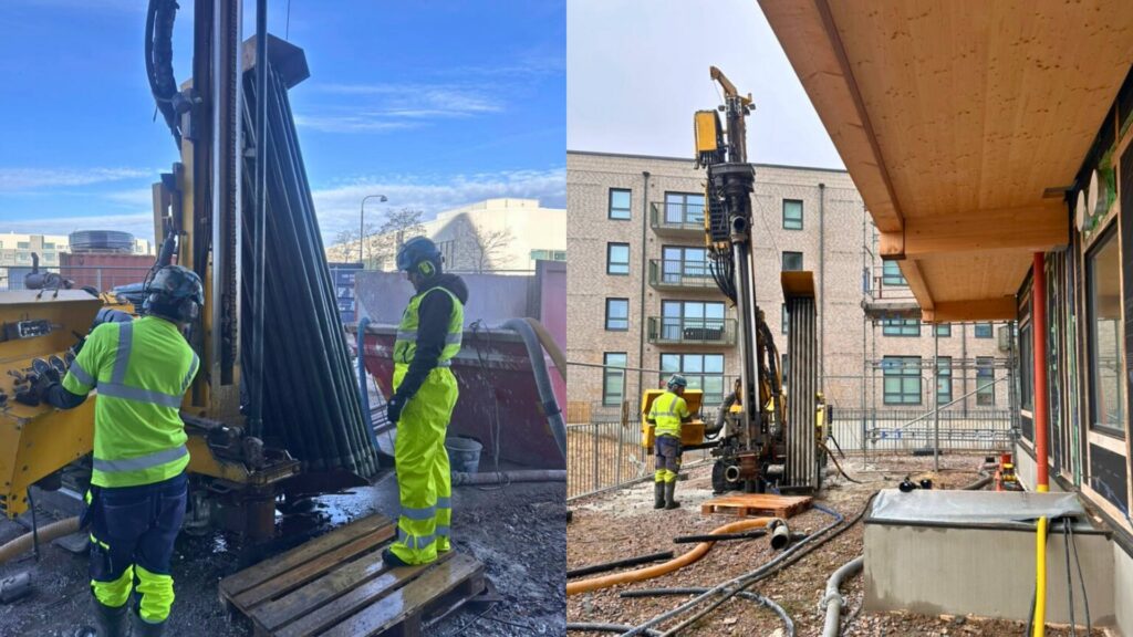 I detta nu pågår borrningen för bergvärmen till hyreshöghuset i Malmö.Här arbetar bygglaget med sex borrhål, vardera cirka 150 meter djupa, för att förse huset med värme från berget. Borrningen är inne på sin andra vecka.