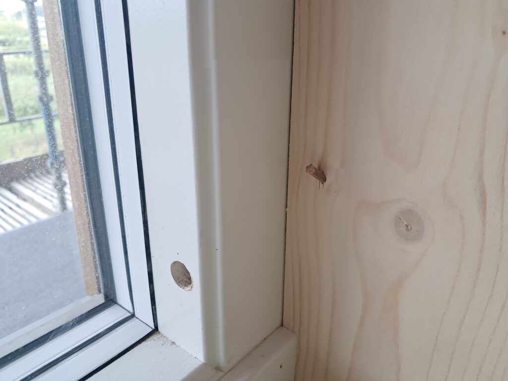 Träspik har skjutits in med spikpistol i lägenhetens vägg. Nu återstår att kapa dem.