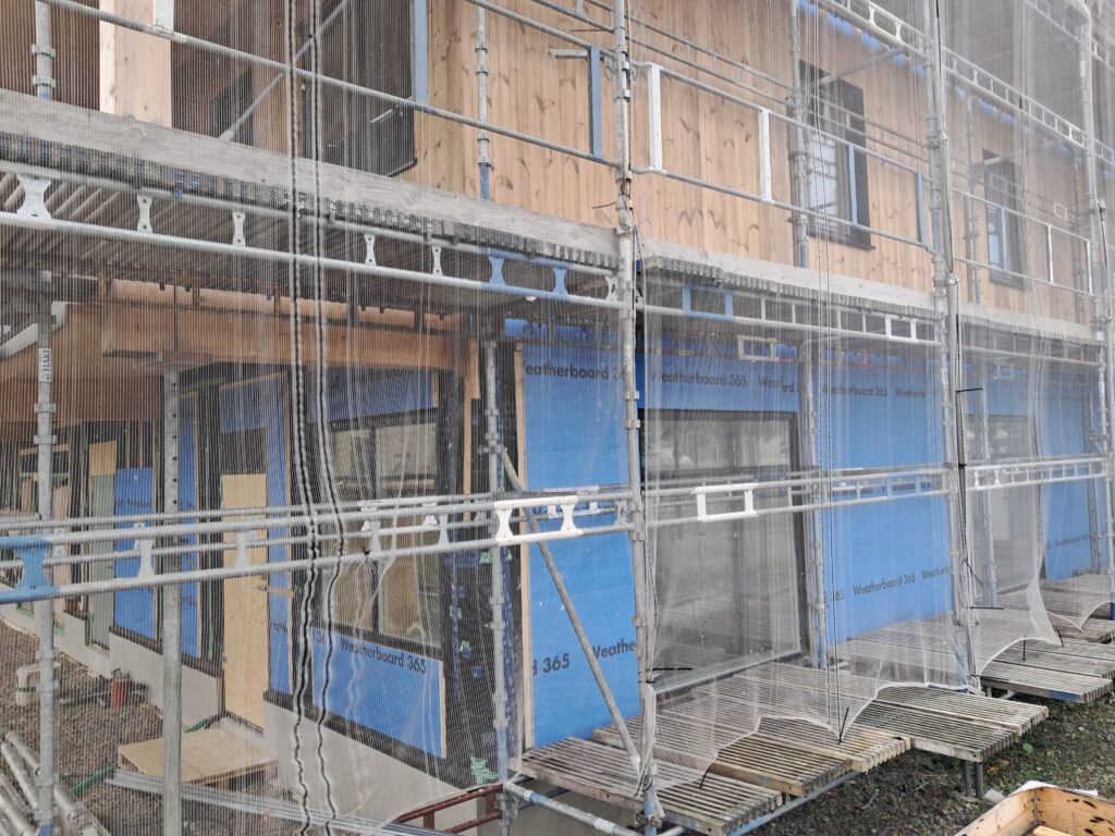 Inne i lägenheterna används trässpikar istället för spikar av metall. Dessa spikar är gjorda av hårt pressat trä och skjuts in med spikpistol. – Spikarna är betydligt dyrare, men bättre ur ett klimatperspektiv och det blir mycket finare med en enhetlig känsla av trä. Hon visar träspiken på en av väggarna. Den är på plats men arbetet är inte klart, eftersom det återstår att kapa den i nivå med väggen. Moa Paulin, och byggets andra projektledare Martin Palm, håller även koll på andrahandsmarknaden för byggmaterial. I sin hand håller Moa en skifferplatta som räddats från ett hus som brunnit. – Vi har möjlighet att köpa in och använda detta till fasaden på entréplan. Tanken var att den delen av fasaden skulle putsas, men återbrukat skiffer är bättre ur hållbarhetsperspektiv.