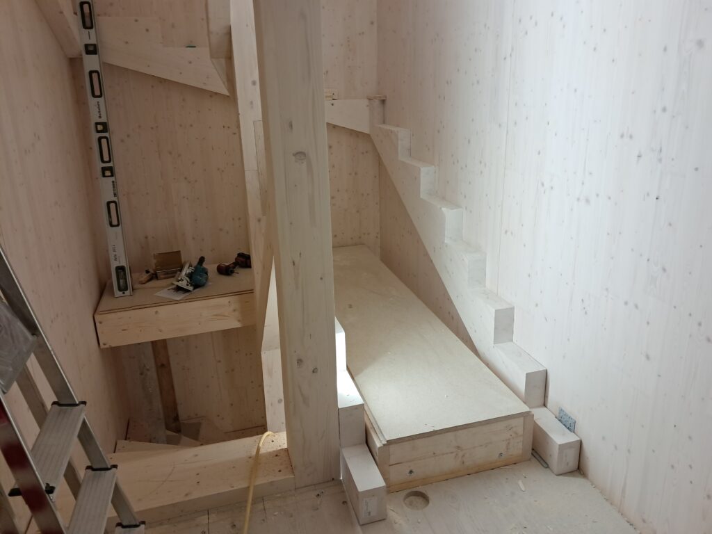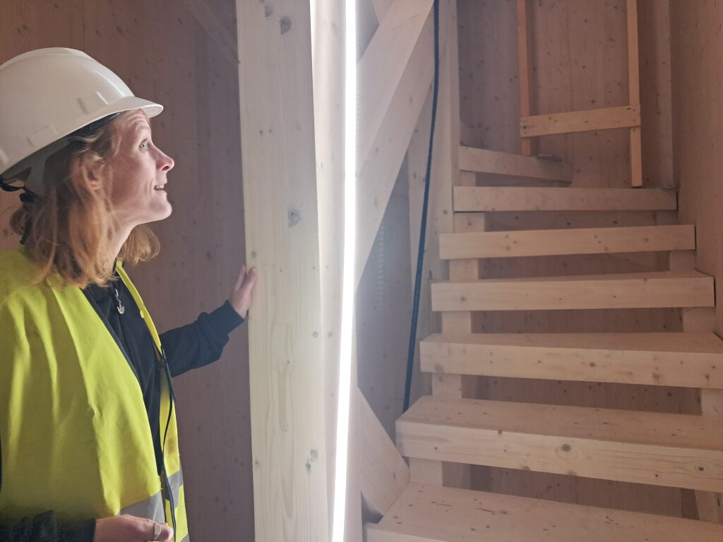 Huset, som blir 12 våningar högt, har två hissar. De är redan installerade och i bruk. Hissarna kompletteras med ett trapphus, som byggs i detta nu. Projektledare Moa Paulin visar. – Du ser hur tjocka trästeg det blir. Det är inte bara snyggt. Det är samtidigt ett klimatsmart materialval och bra ur brandsäkerhetssynpunkt.