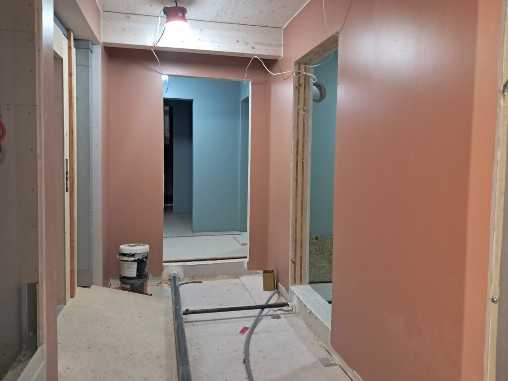 Arbete pågår av olika hantverkare parallellt. Stora delar av trapphusen är nu målade. Den blå färgen markerar förrådsutrymme.