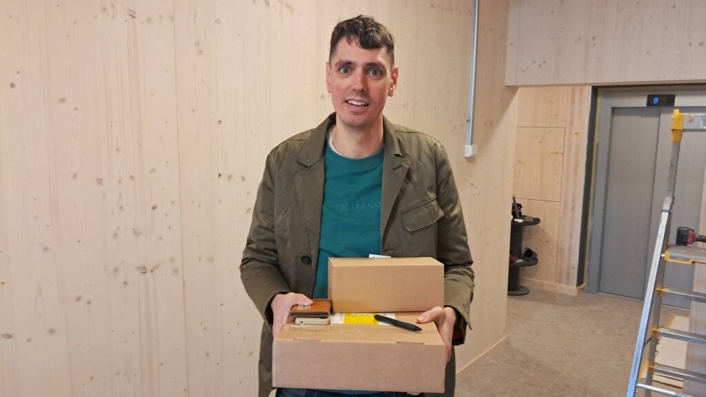 Mattis dyker upp i byggboden för att raskt äta sin lunch. – Nu har jag hämtat nyckelskåpet, som installeras i eftermiddag. Därefter möter jag Markus från GoRide som är här för att testa laddboxen till husets elbilspool. När jag är klar med sorteringen av nycklar ska jag gå in i alla lägenheter som får hyresgäster imorgon och starta kyl och frys och jag ska märka upp förråden. Därefter tänker jag skriva ett mejl till hyresgästerna som flyttar in imorgon. Jag vill bland annat berätta varför vi har byggställningen kvar på husets söderfasad, det är för att leveransen av solceller som ska sättas upp där olyckligtvis blivit försenad.