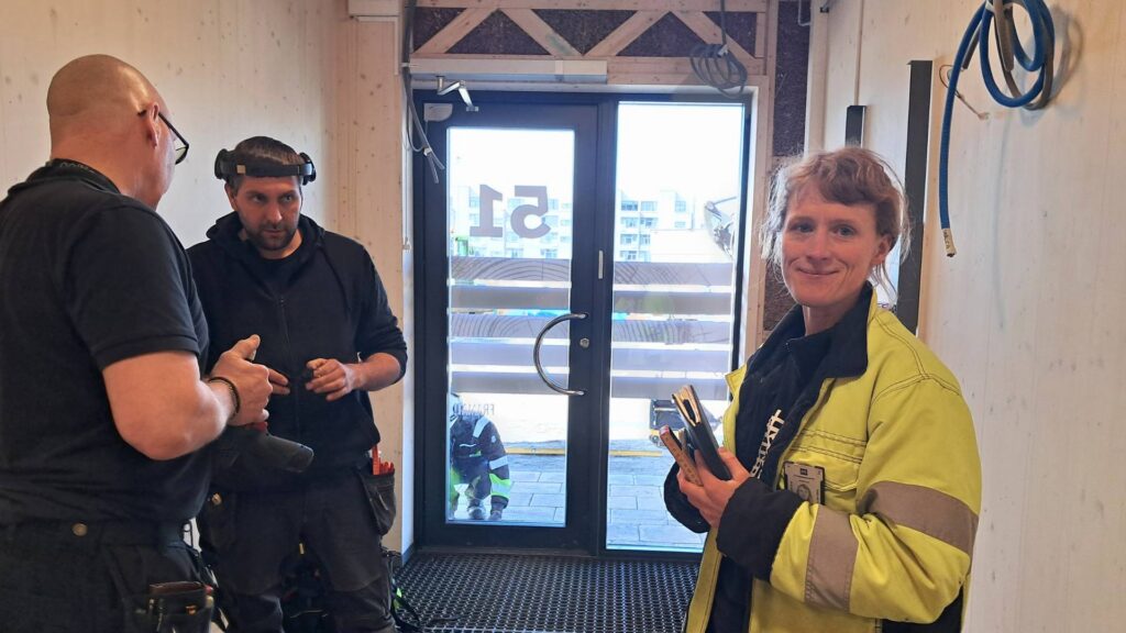 Vid ETC Byggs höghus i Malmö arbetar två plattsättare med att lägga sten. De kapar, jämnar ut sättsand och arbetar metodiskt, sten för sten. Endast ett par timmars arbete återstår för dem innan ytan kommer att bli klar. Inne i husets entré möts projektledare Moa Paulin och fastighetsansvarig Mattis Berg. – Jag har nycklarna här, jag sätter mig och sorterar dem nu, säger Mattis. – Bra, svarar Moa och vänder sig sedan till en elektronikinstallatör. Han håller på att installera en informationstavla i entrén och får hjälp av en av husets elektriker. De talar om materialbehov och inkoppling. – Tack, nu har jag det jag behöver, så nu klarar jag mig. Elektrikern skyndar vidare.